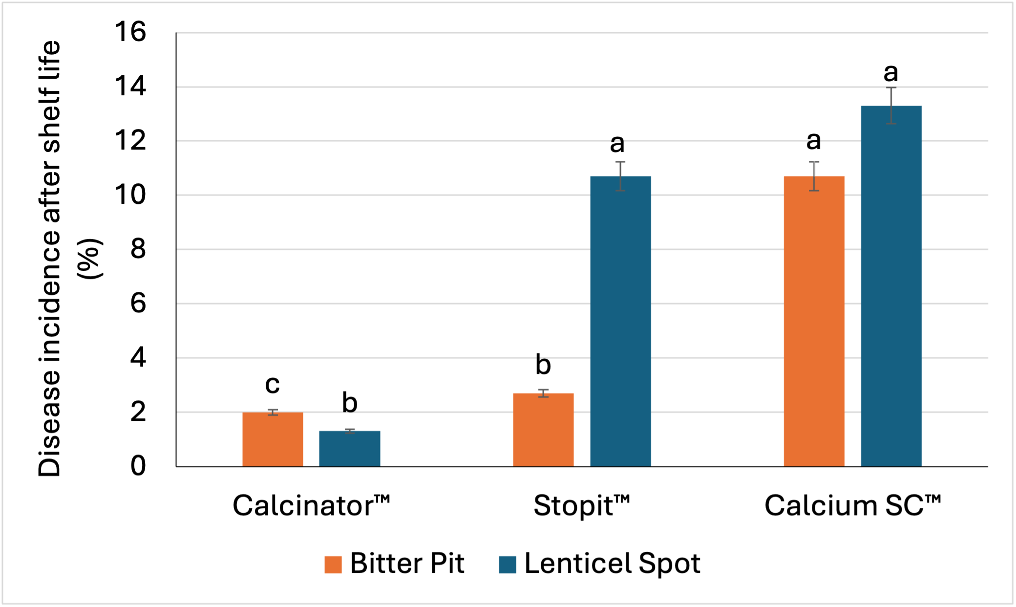 Figure 1: Comparison of post-harvest disease incidence on Golden Delicious apples after simulated shelf life, recorded after foliar applications of CALCINATOR™, CaCl2 and CaCO3 products.