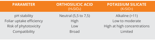 In contrast, orthosilicic acid (H4SiO4) is a neutral molecule (pKa ~9,5) and remains soluble at typical spray solution pH levels (5,5 to 7,0), allowing efficient penetration and assimilation (Table 1).